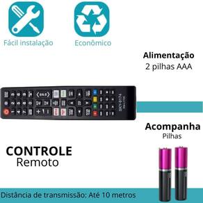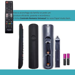 Descrição do anúncio: Conteúdo da embalagem: 1 controle remoto universal compatível com tv 2 pilhas aaa Características: Material de alta qualidade Teclas macias Plástico resistente Led transmissor com excelente tempo de resposta Funciona com todos os modelos de tv sem necessidade de configuração Especificações: Modelos compatíveis: bn5901199f Composição: plástico e teclas de borracha Dimensões: 18 cm a x 5 cm l Alimentação: 2 pilhas aaa 1.5v Cor: preto Homologação: 025011103596 Principais perguntas sobre o produto e respostas: 1 este controle funciona com todas as tvs samsung Sim, o controle é compatível com todos os modelos de tv samsung, incluindo tubo, plasma, lcd e led. 2 preciso configurar o controle antes de usar Não, o controle funciona de forma simples e completa sem necessidade de configuração. 3 as pilhas estão incluídas no pacote Sim, o controle vem com 2 pilhas aaa. Homologação Anatel: 112572013224 Marca: Lippin