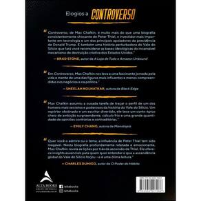 “Controverso, de Max Chafkin, é muito mais do que uma biografia consistentemente chocante de Peter Thiel, o investidor mais importante em tecnologia e um dos principais apoiadores da presidência de Donald Trump. É também uma história perturbadora do Vale do Silício que fará você reconsiderar as bases ideológicas do incansável mecanismo de destruição criativa dos Estados Unidos.” — Brad Stone, autor de A Loja de Tudo e Amazon Unbound Em Controverso, Max Chafkin nos leva a uma fascinante jornada pela vida e mente de uma das figuras mais influentes e menos compreendidas nos negócios e na política.” — Sheelah Kolhatkar, autora de Black Edge Max Chafkin assumiu a ousada tarefa de traçar o perfil de um dos homens mais secretos e poderosos da história do Vale do Silício. Um repórter obstinado e um escritor divertido, ele tece um conto épico cheio de ambição surpreendente, cálculo frio e uma grande quantidade de opiniões contrárias e contraditórias.” — Emily Chang, autora de Manotopia Quer você o admire ou o tema, a influência de Peter Thiel tem sido inegável. Nesta biografia profundamente relatada e emocionante, Max Chafkin revela as lições por trás da ascensão de Thiel. Ele oferece insights essenciais para quem quer entender o que a ascendência global do Vale do Silício forjou – e é uma ótima leitura.” — Charles Duhigg, autor de O Poder do Hábito