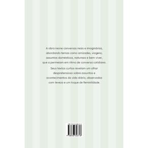 Sinopse do livro: A obra reúne conversas reais e imaginárias, abordando temas como amizades, viagens, assuntos domésticos, natureza e bem viver, que a permeiam em ritmo de conversa cotidiana. Seus textos curtos revelam um olhar despretensioso sobre assuntos e acontecimentos da vida diária, observados com leveza e um toque de feminilidade.