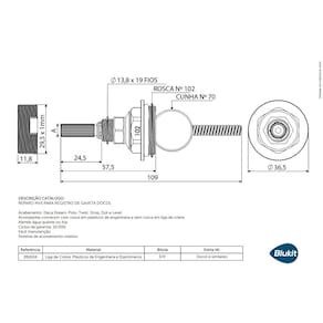 Referência Material Estria Acabamento Rosca Cunha Bitola 281604 Liga de Cobre, Plásticos de Engenharia e Elastômeros Docol e similares Deca Dream, Polo, Twist, Drop, Dot e Level nº 102 nº 70 3/4"