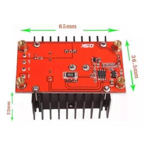 Especificacoes Tensao de entrada: 1032 Vdc Tensao de saida: 1235 V ajustavel Corrente de saida: 10A MAX. Corrente de entrada: 16A MAX Acima de 10A, melhorar dissipacao de calor Potencia de saida: Com resfriamento natural 100 W MAX -- Com dissipacao melhorada ventilacao forcada por exemplo- cooler 150 W MAX Eficiencia de conversao: 94% Entrada 16 V, saida 19 V 2.5A Consumo de corrente sem carga: 25mA tipico Nao possui protecao contra curto circuito Por Favor Instale fusiveis e circuitos de protecao na entrada. Nao possui protecao contra inversao de Polaridade Por Favor confira bem a polaridade de entrada antes de ligar e/ou instale um diodo em serie no conector de entrada. Dimensoes: 655023 comprimento Largura Altura mm
