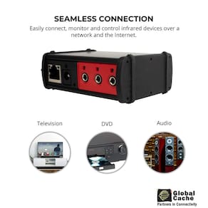 - Conecta até 3 dispositivos infravermelhos – Através do Global Caché IP2IR iTach, você pode conectar até 3 aparelhos IR à internet através dos conectores estéreo de 3,5 mm. Isso torna os dispositivos "habilitados para IP"