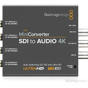 O conversor SDI para áudio da Blackmagic Design possui um design compacto que converte rapidamente e facilmente sinais SDI em áudio com o Micro Conversor da Blackmagic, desincorporando o áudio de qualquer fonte SDI em formatos SD e HD até 1080p60. A saída de áudio possui conectores de 1/4" que permitem enviar sinais analógicos balanceados e AES/EBU para mesas de mixagem, decks analógicos, monitores de áudio e outros dispositivos. As conexões são multirrate e detectam e alternam automaticamente os formatos conforme necessário. Sua construção compacta e robusta permite que o conversor funcione com segurança e facilidade, seja em racks de equipamentos em estúdios, em caminhões de notícias ou até mesmo em ambientes externos para transmissões esportivas ao vivo e outros eventos. Inclui tudo o que é necessário para desmobilizar 4 canais de áudio analógico ou 8 canais de áudio digital AES/EBU a partir de qualquer conexão de vídeo SDI. Agora é possível acessar facilmente o áudio em qualquer conexão de vídeo SDI para enviá-lo para equipamentos de áudio, como mesas de mixagem de áudio, plataformas de transmissão analógica, monitores de áudio e muito mais!