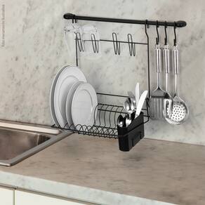 Cook Home 8 Arthi Black Edition - Organização Suspensa Completa O Cook Home 8 da Arthi, Black Edition, é um sistema modular e suspenso que transforma a organização da sua cozinha, liberando espaço na bancada. Ele oferece um kit completo que inclui uma barra para fixação, um escorredor de louças e ganchos multiúso, tudo com o sofisticado acabamento preto. Características Físicas e Funcionais: Sistema Suspenso: Projetado para ser instalado na parede, utilizando o espaço vertical e liberando a área de trabalho da bancada. Organização Completa: Inclui barra (49 cm), escorredor e 3 ganchos, permitindo secar louças e pendurar utensílios, panos de prato ou acessórios. Estilo Moderno: Acabamento em Pintura Epóxi na cor Preta sobre Aço Carbono, que confere um visual elegante, minimalista e resistente à umidade (Black Edition). Durabilidade: A combinação de Aço Carbono com a pintura epóxi garante um produto robusto e maior vida útil em ambientes de cozinha. Instalação: Acompanha kit de buchas e parafusos para fixação segura na parede. Marca: Arthi (Ref. 2526). Especificações Técnicas: Funcionalidade: Escorredor e organizador de parede. Cor: Preto (Black). Dimensões do Conjunto Montado: Comprimento 52 X Largura 28 X Altura 47,5 cm. Conteúdo: 1 barra de 49 cm, 3 ganchos, 1 escorredor, 1 kit para pendurar. Material: Aço Carbono com Pintura Epóxi.