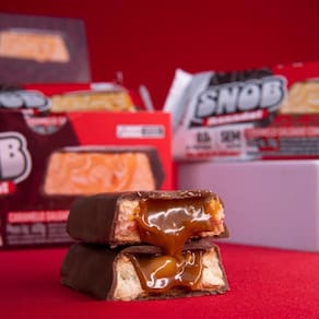 Snob é a primeira barrinha de proteína assada ela é sem glúten, zero açúcar e com 9g de proteínas por barra.