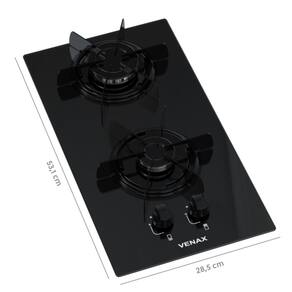 Ficha Técnica: Tipo: Cooktop Acendimento: Super Automático Queimadores: 1 Rápido e 1 Semi-Rápido Trempes dos Queimadores: Individual Esmaltadas Mesa Queimadores Vidro Temperado Base das Trempes: Esmaltadas Botões: Removíveis Entrada de Gás: Uma Entrada (Lado direito visto de frente) Marca: Venax Alimentação: Gás GLP (A conversão para Gás Naural não é coberta pela garantia) Tensão: Bivolt Frequência: 50/60Hz Classificação Energética: "A" Etiquetas: ENCE e CONPET Garantia: 1 Ano Potência Queimadores: 3,00kW,(rápido), 1,75kW(semi-rápido) Medidas do Nicho para Embutir (LxP): 24,5 cm x 45 cm