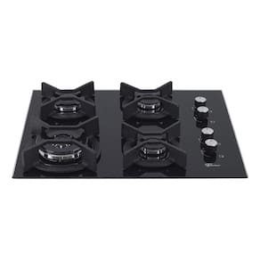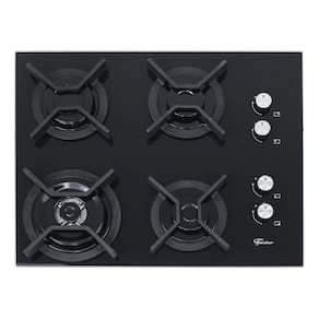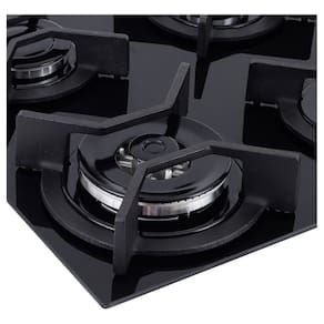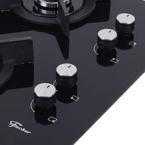 Cooktop de embutir com mesa em vidro temperado na cor preta, trempes individuais em ferro fundido esmaltado e 4 queimadores com tecnologia italiana.Luz de calor residual