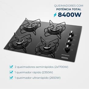 Cooktop a Gás 4 Bocas Mondial Automático CTG-01 Preto Bivolt. Mesa com melhor disposição e aproveitamento entre as bocas. 4 queimadores com potência total de 1 queimador ultrarrápido (2650W), 1 queimador rápido (2350W), 2 queimadores semirrápidos (2x 1700W). Mesa de vidro temperado. Botões com acabamento em aço inox e removíveis. Trempes esmaltadas individuais.Luz de calor residual