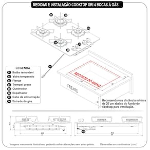 Produto projetado para GLP -botijao-. Para instalacoes seguras, siga o manual e as normas locais. Em bancadas de pedra/composito, respeite o nicho e as folgas de ventilacao informadas acima.