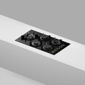 Cooktop a gás de 5 bocas com design sofisticado em vidro preto, ideal para cozinhas modernas. Possui acendimento automático e chama Quadri para distribuição uniforme de calor.Luz de calor residual
