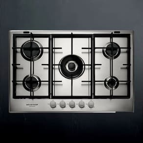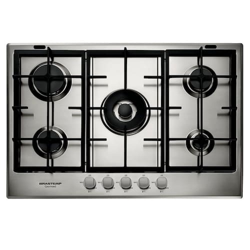 Cooktop Brastemp Gourmand com 5 bocas, queimador Quadrichama, trempes de ferro fundido, mesa de inox e acendimento superautomático.Luz de calor residual