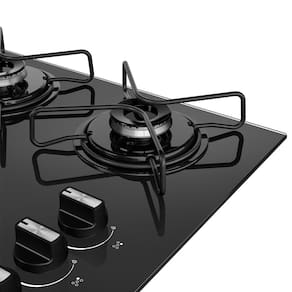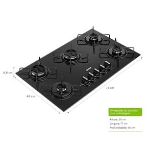 Cooktop a gás com 5 bocas, mesa de vidro temperado preta, acendimento superautomático, grades individuais resistentes, botões removíveis.Luz de calor residual