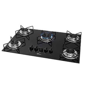 Cooktop Fischer 5 bocas com mesa de vidro temperado preto, trempes esmaltadas com 4 pontos de apoio, queimadores italianos de alta eficiência, acendimento superautomático e design moderno.Alimentação