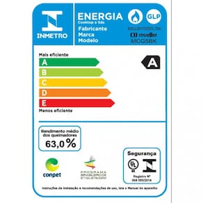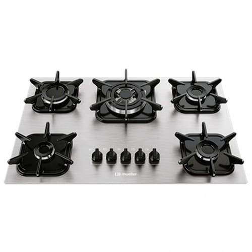Cooktop Mueller 5 bocas com tripla chama, mesa de alumínio com acabamento escovado e anodizado, trempes em ferro fundido e acendimento superautomático.Alimentação