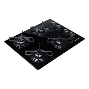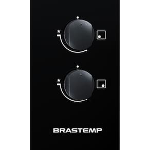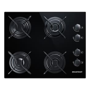 Cooktop a gás Brastemp com 4 bocas, sendo 3 pequenas e 1 grande, acendimento superautomático, grades em piatina e acabamento em vidro preto.Alimentação