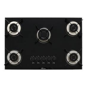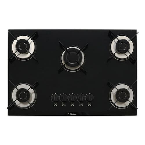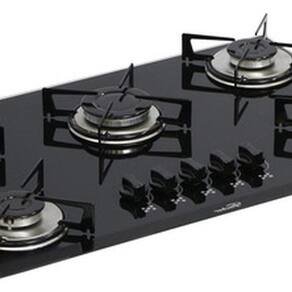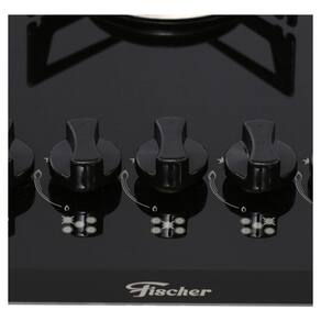 Cooktop a Gás Fischer com 5 bocas, mesa de vidro temperado preto ébano, trempes individuais em aço carbono esmaltado e acendimento superautomático.Luz de calor residual