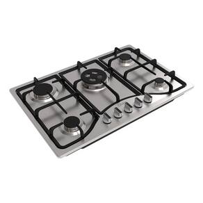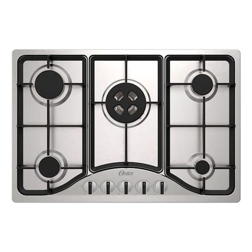 Cooktop a Gás Oster com 5 bocas, acendimento automático, dimensões de 76x50,8 cm, acabamento em inox e potência máxima de 11400 W. Ideal para uso semiprofissional.Alimentação