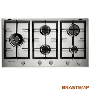 Cooktop Inox 5 Bocas Brastemp Gourmand com queimador megachama na lateral, que facilita o preparo de receitas com panelas maiores e proporciona mais conforto ao cozinhar. Válvula de segurança. Acendimento superautomático.