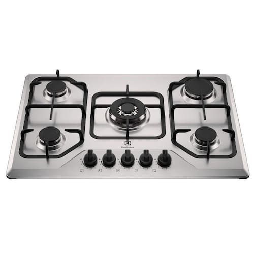 Cooktop a gás Electrolux 5 bocas com queimador Multi Chama, grades de ferro fundido, Tecnologia ChamaPrecisa com 6 níveis de potência, acendimento superautomático e mesa de aço inox escovado.Luz de calor residual