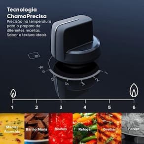 Para que você possa explorar mais ao cozinhar, a Tecnologia ChamaPrecisa oferece 6 níveis pré-programados de potência. Tenha mais precisão na temperatura durante o preparo de diferentes receitas e garanta sabor e textura ideais aos seus pratos. Confira os níveis: