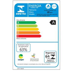 Caracteristicas: Bocas: 4 bocas Trempe: Aco esmaltado Acendimento superautomatico: Sim Tipo de gas -sai de fabrica GLP-: GLP Consumo de gas: 0,6001 Kg/h Funcionamento: Gas Potencia das Bocas: 1 rapidos -3.000W-, 3 semirrapidos -1.750W- Bocas seladas: Sim Inmetro: 012246/2024