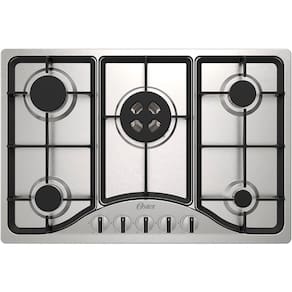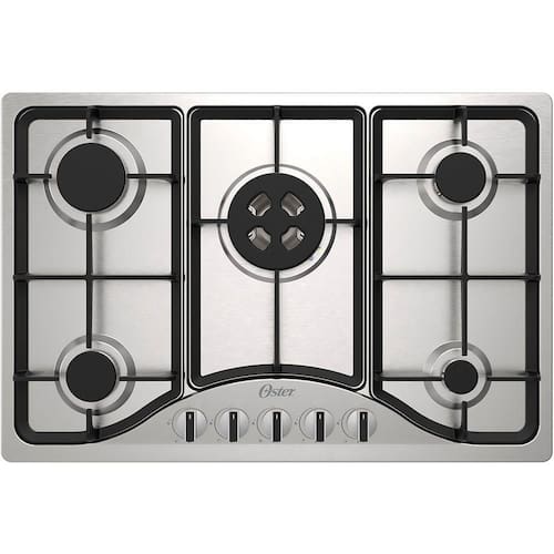 Cooktop a gás Oster semiprofissional com 5 queimadores (1 ultrarrápido tripla chama de 4000W, 1 rápido de 3000W, 2 médios de 1750W, 1 auxiliar especial de 900W), totalizando 11400W. Mesa de inox, trempes de ferro fundido e sistema Flameout Safety protection.Luz de calor residual