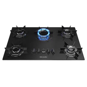 Mesa de vidro temperado preta, 5 bocas, Ultra Chama, Acendimento automático, botões ergonômicos, trempes de ferro fundido.Luz de calor residual