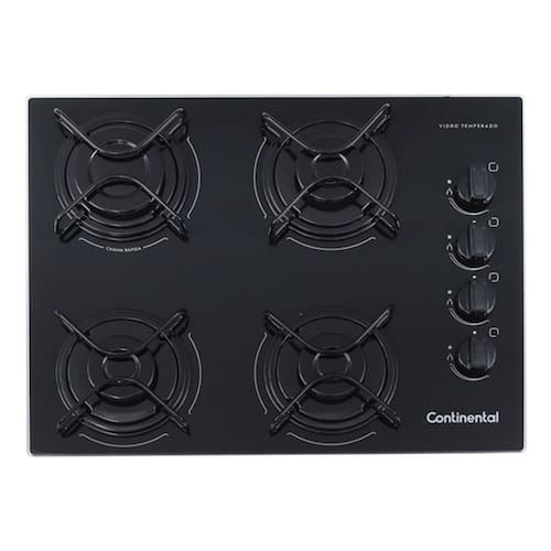 Cooktop a gás Continental com 4 bocas, acendimento superautomático, mesa de vidro preto, design moderno e funcional, queimadores potentes e resistentes.Luz de calor residual