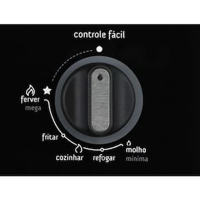No cooktop há um botão especial, o “Controle Fácil”, que traz dicas de uso para cada tipo de preparo, indicando a potência ideal.