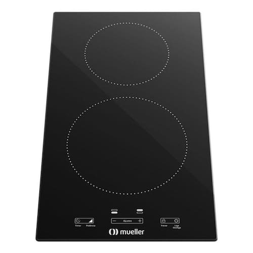 Cooktop de indução com mesa vitrocerâmica preta, duas zonas de aquecimento independentes, função Turbo Potência, painel touch control com 9 níveis de potência, timer digital com alerta sonoro, trava de segurança no painel, dimensões compactas para embutir em nichos de 27 cm x 49 cm, compatível com panelas de fundo magnético.Luz de calor residual