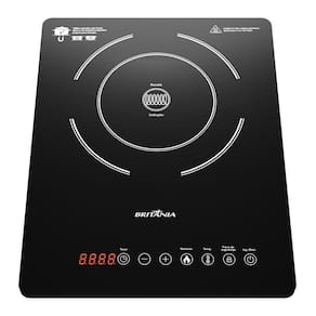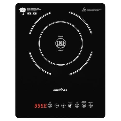 Cooktop de Indução Britânia BCT14P com 1 queimador, 10 níveis de potência e temperatura (60C a 240C), timer de até 180 minutos, display digital, painel touch, desligamento automático de segurança e base em vidro cerâmico.Luz de calor residual