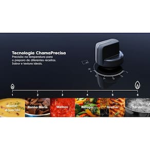 Para que você possa explorar mais ao cozinhar, a Tecnologia ChamaPrecisa oferece 6 níveis pré-programados de potência. Tenha mais precisão na temperatura durante o preparo de diferentes receitas e garanta sabor e textura ideais aos seus pratos. Confira os níveis: 1 - Derreter e Manter Aquecido; 2 - Preparos em panela de pressão e Banho-Maria; 3 - Preparar Molhos; 4 - Refogar; 5 - Grelhar e Fritar; e 6 - Ferver.