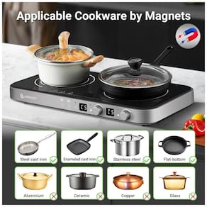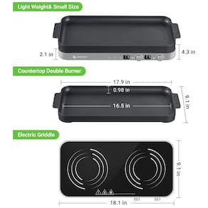 Cooktop elétrico de indução portátil com dois queimadores de 1100W cada, chapa de ferro fundido removível antiaderente, sensor de toque e 9 níveis de potência.Luz de calor residual