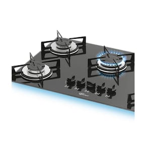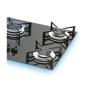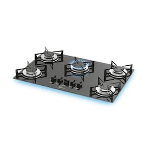 Mesa em vidro temperado preto ébano, 5 queimadores, acendimento superautomático, trempes individuais.Luz de calor residual