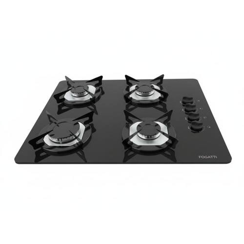 Cooktop de embutir com 4 bocas, mesa em vidro temperado preto, acendimento automático e sistema anti-rotação nas grades.Luz de calor residual