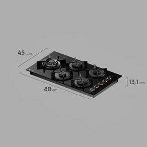 Resumo das caracteristicas e especificacoes: - Produto: Cooktop - Alimentacao: a Gas - Tensao Eletrica: Bivolt - Portatil: Nao - Dimensao: 13,1x80x45 cm - Largura do Nicho para Cooktop: 76 cm - Profundidade do Nicho para Cooktop: 39 cm - Peso do Produto: 12,50 Kg - Material: Vidro - Tonalidade: Preto - Quantidade de Bocas: 5 - Chama: Quadri - Acendedor: Automatico - Potencia Maxima: 12700 W - Linha: Pro Series - Referencia do Produto: KE5PS - Garantia do Fabricante: 12 meses."