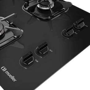 Cooktop Mueller 4 bocas com queimador Ultra Chama de 2400 Watts, grades de ferro fundido com 6 pontos de apoio, mesa de vidro temperado e acendimento superautomático.Luz de calor residual