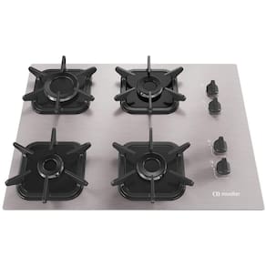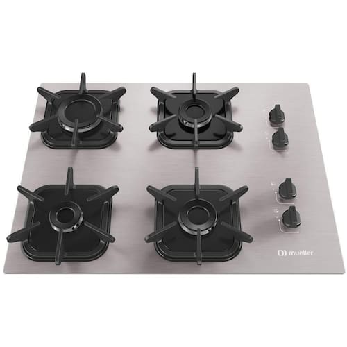 Cooktop Mueller 4 bocas com queimador ultra chama, grades de ferro fundido com 6 pontos de apoio e acendimento superautomático.Alimentação