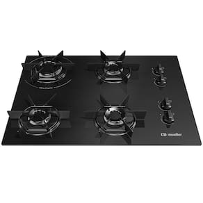 Cooktop Mueller 4 bocas com queimador Ultra Chama de 2400W, mesa de vidro temperado, grades individuais em aço esmaltado, acendimento superautomático e design moderno.Luz de calor residual