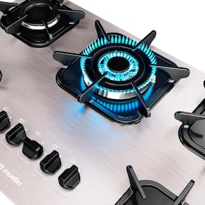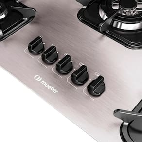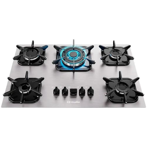 Cooktop Mueller 5 bocas em alumínio com queimador tripla chama. Acendimento superautomático, grades em ferro fundido com encaixe na mesa. Design moderno e sofisticado.Alimentação