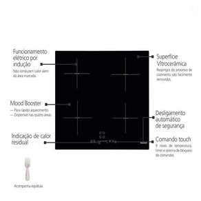 Características Tipo: Indução Quantidade de Bocas: 04 Tipo de Acendimento: Eletrônico Tipo de Queimadores: 04 indução Painel: Touch / digital Timer: Sim Mesa sem Furação Níveis de Temperatura: 09