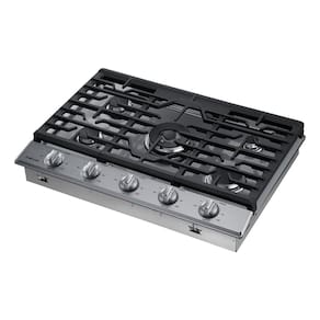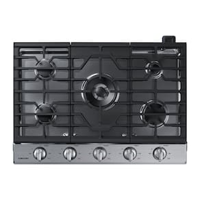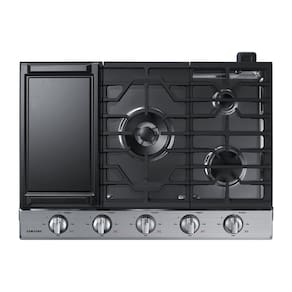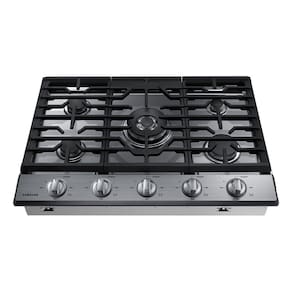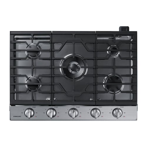 Cooktop Samsung Inox com 5 queimadores, conectividade Wi-Fi, queimador duplo, acendedores retroiluminados em LED azul e grades de ferro fundido.Luz de calor residual