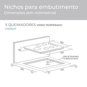 Conteúdo da Embalagem: 01 Cooktop Vidro Temperado 5 queimadores com Tripla Chama Lateral
