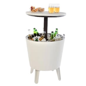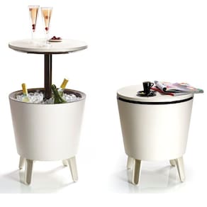 Conheça seu Cooler Cool Bar Branco Keter Além de ser um cooler de 30 litros, o Cool Bar pode ser usado como uma mesa de apoio para os petiscos e copos. Com design moderno, versátil e encantador, é ideal para ser usada em churrascos, happy hours, e confraternizações com amigos e familiares. Este modelo tem parte interna na cor preta. Seu sistema incrível de isolamento térmico, irá manter por até 12 horas a temperatura das suas bebidas! Produzido com tecnologia israelense, o produto é manufaturado em Resina de Polipropileno de altíssima qualidade Keter