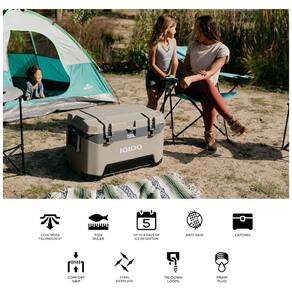 A construção moldada por sopro resistente oferece durabilidade avançada. Paredes de espuma extra grossas e tampa isolada fornecem cinco dias de retenção de gelo. As travas em T duráveis e emborrachadas da tampa fornecem um fechamento e travam no frio. Alça de garra de ponto triplo com reforço de aço inoxidável e alça de borracha. O plugue de drenagem rosqueado oferece a opção de conectar sua mangueira de água para facilitar a drenagem Marca: Não Informado