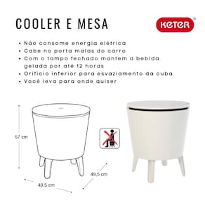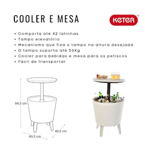 Cooler Mesa Bistrô com Iluminação LED Keter | Exclusividade com Estilo e Funcionalidade|Conheça o Cooler Mesa Bistrô Iluminado com LED da Keter, uma exclusividade que une design premiado, praticidade e inovação para tornar seus momentos ao ar livre ainda mais especiais. Ideal para varandas, jardins, festas e churrascos noturnos, este produto oferece o equilíbrio perfeito entre mesa de apoio, balde térmico e iluminação ambiente.||Com estrutura inspirada no clássico Cool Bar Keter, o modelo iluminado conta com LEDs recarregáveis embutidos que realçam a experiência noturna com charme e sofisticação. A cuba térmica de 37L mantém suas bebidas geladas por até 12 horas, enquanto o tampo retrátil pode ser elevado até 84,5 cm para se transformar em uma mesa estilo bistrô.||Beleza, praticidade e inovação em um só produto. Seja para servir petiscos ou manter as bebidas sempre à mão, o Cooler Bistrô com LED é a escolha ideal para anfitriões exigentes e eventos memoráveis.||Diferenciais do Produto|Exclusivo da Keter: modelo iluminado com LED recarregável embutido|3 em 1: cooler, mesa de apoio e peça decorativa com iluminação|Tampo retrátil: eleva-se até 84,5 cm, transformando-se em mesa bistrô|Cuba térmica de 37L: armazena até 42 latas (aproximadamente)|Isolamento térmico: mantém as bebidas geladas por até 12 horas com a tampa fechada|Válvula de escoamento: facilita a drenagem da água após o uso|Fácil de limpar: não enferruja, não mancha e pode ser lavado com água|Visual moderno: ideal para compor ambientes externos com elegância||Medidas do Produto|Fechado: 49,5 cm (A) x 49,5 cm (L) x 57 cm (P)|Com tampo elevado: altura total de 84,5 cm|Capacidade: 37 litros|Armazena até: 42 latas (aproximadamente)||Dados de Embalagem|Peso total: 6 kg|Altura: 50 cm|Largura: 50 cm|Profundidade: 41 cm||SKU: 17204184|EAN: 7290106933866||Informações Importantes||Produto promocional: condições válidas enquanto durarem os estoques|Preços e condições válidos apenas para compras no site Keter Online|Não requer montagem: siga apenas as instruções de uso do fabricante|Evite produtos químicos na limpeza: utilize apenas água|Consulte nossa política de trocas e devoluções para garantir seus direitos