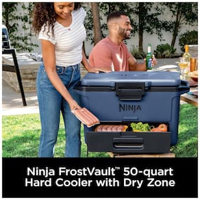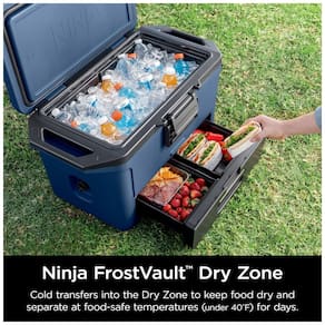 Este cooler de 46,65 litros apresenta a tecnologia FrostVault, que transfere o frio para a Zona Seca, mantendo os alimentos frescos, secos e separados em temperaturas seguras abaixo de 4ºC por dias. Sua capacidade alta permite armazenar até 80 latas sem gelo ou 45 latas com gelo. Além disso, possui retenção de gelo premium, mantendo o gelo por até 5 dias para acompanhar qualquer aventura. A construção é altamente durável e resistente, com até 3 polegadas de isolamento. A embalagem mais inteligente permite embalar facilmente os alimentos sem transferi los para recipientes secundários estanques, mantendo as bebidas e os alimentos completamente separados. As alças pesadas são duráveis e integradas, tornando o refrigerador fácil de transportar para a praia, churrasco ou porta traseira. Possui tampa com trava e trava de gaveta para proteger o refrigerador, além de um easy latch premium que permite abrir e fechar facilmente o refrigerador, mesmo com uma mão. O produto inclui o cooler de 46,65 litros com FrostVault Dry Zone.
