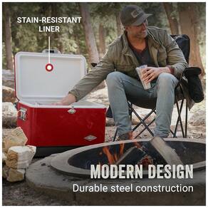 O refrigerador de alta capacidade e resistente apresenta um design retrô encantador. A capacidade de 54 litros acomoda até 85 latas. As peças de plástico do refrigerador incluem os bujões de drenagem, dobradiças e alças. O isolamento premium oferece retenção de gelo de 4 dias. Construído para oferecer anos de desempenho com hardware de aço inoxidável resistente à ferrugem. Alças de aço de aderência confortável permitem levantamento e transporte fáceis e controlados Marca: Não Informado