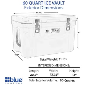 PREPARAR. DEFINIR. VIAGEM O Blue Coolers 60 Litros Ice Vault suportará o abuso mais difícil devido à melhor durabilidade da classe. Se você precisa simplesmente manter o sol afastado em um jogo de futebol ou precisa de um refrigerador que possa suportar ursos, insetos e a vida selvagem ao ar livre, o refrigerador de acampamento Blue Coolers fará isso
