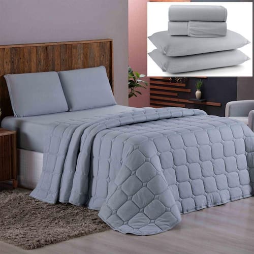 Tecido: Malha Penteada 100% Algodão - garante maciez, respirabilidade e durabilidade.Acolchoado: Cobre leito todo acolchoado, proporcionando maciez e fofura incomparáveis.Matelado: Detalhes em matelado quadriculado que conferem um design sofisticado e elegante.Acabamento: Viés em todo o contorno do cobre leito, garantindo um acabamento impecável e maior Travesseiros com Zíper: Os porta travesseiros acompanham zíper, facilitando a troca e a lavagem, além de garantir um ajuste perfeito.